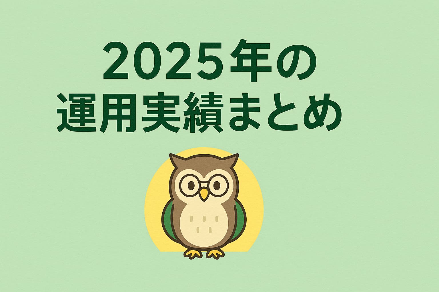 「2025年の運用実績まとめ」という日本語タイトルが中央に配置された横長バナー。背景は緑と黄色のグラデーションで、中央には投資チャートを持ったかわいらしいフクロウのイラストが描かれている。落ち着いた配色と余白の多いデザインで、少額投資の年間まとめをイメージしたアイキャッチ画像。 社会人向け