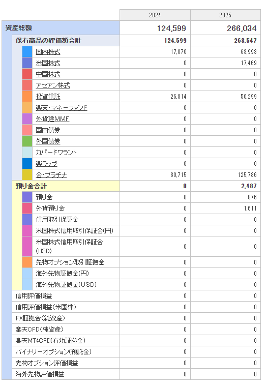 2025年は、毎月の少額投資とポイント投資を積み重ねることで、年間を通して資産が着実に増加しました。特に国内株式と投資信託の評価額が伸び、金の価格上昇もポートフォリオ全体を押し上げる要因となりました。年初と比べると、資産総額は大きく増え、少額投資でも継続することで成果が見えることを再確認できた一年です。