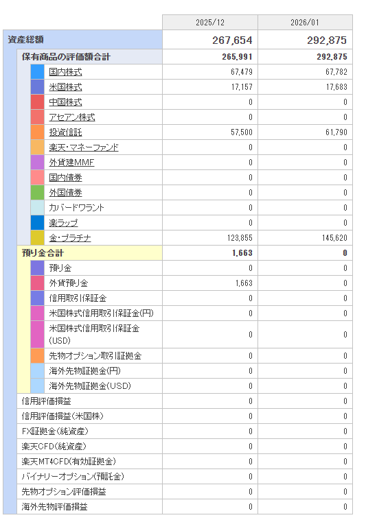 2026年1月のポートフォリオを記録しました。毎月1万円ほどの少額投資でも、日本株の配当や投資信託の積立、米国ETFの買付を組み合わせることで、資産が少しずつ積み上がっていく様子を確認できます。今月は金の評価額が大きく伸びたことで、ポートフォリオ全体のバランスに変化が出るなど、継続して記録しているからこそ気づける動きもありました。